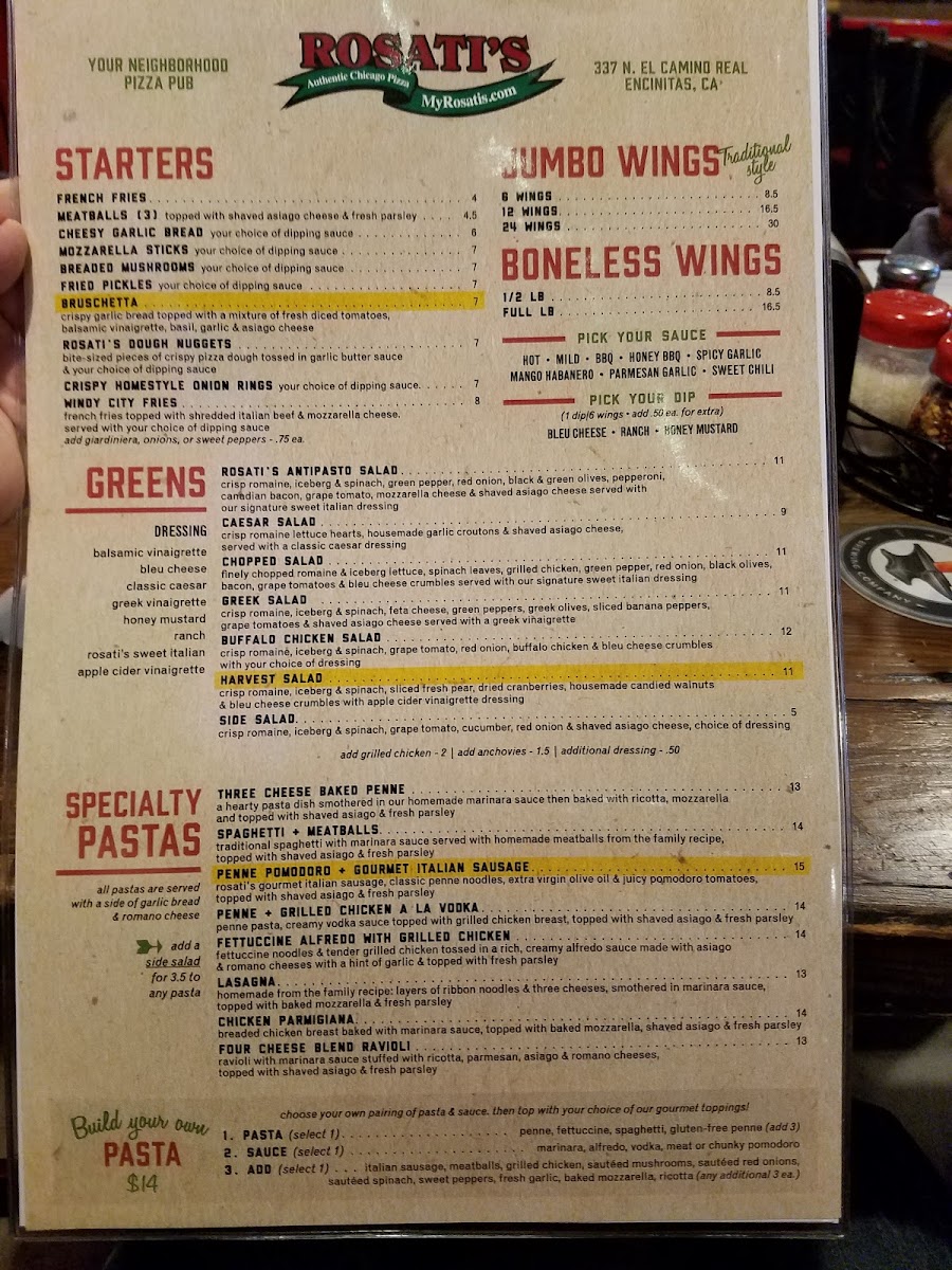 Rosati's Pizza, located at 337 N El Camino Real, Encinitas, CA, offers a diverse and appetizing menu that caters to various tastes. Starting with the Greens, the Rosati's Antipasto Salad stands out as a refreshing choice, offering a balance of flavors to kick off your meal.